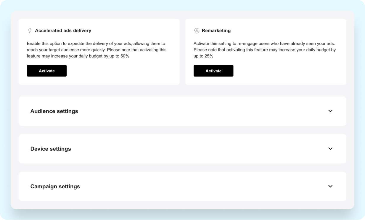 - Use tools like Accelerated Ads Delivery and Remarketing to boost conversions