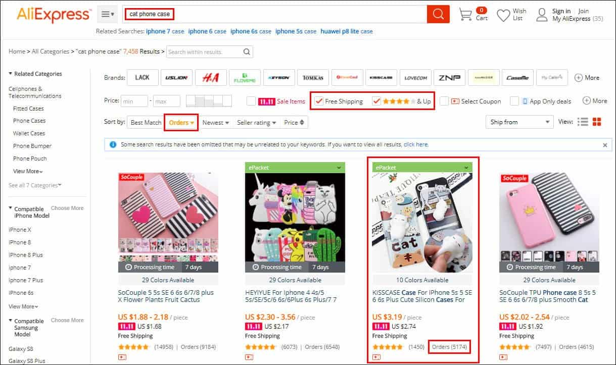 You make a search request “cat phone case” and choose “Newest” as a filter. Shown products in the list are not insanely popular and, in some cases, they were never yet bought… But the main point is a seller’s high rating.