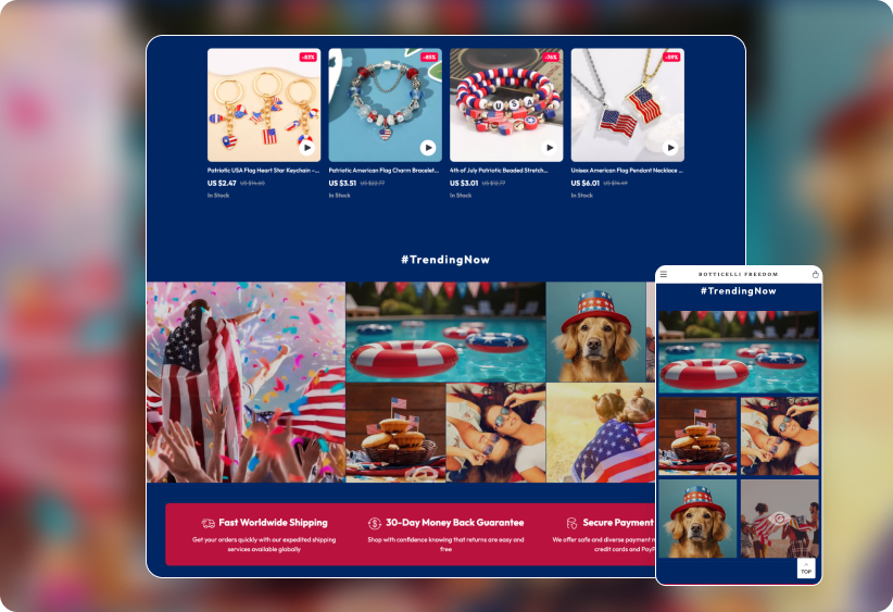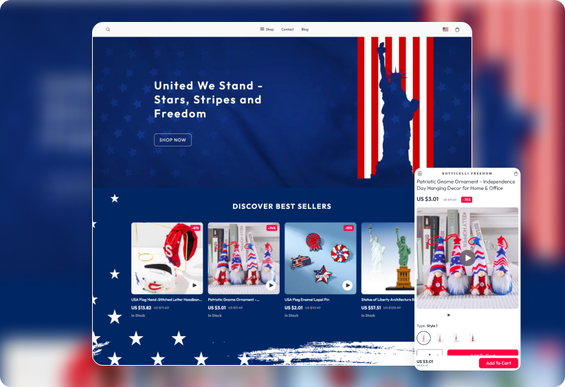 To help you tap into this demand, we’ve launched a special Independence Day Product Package + Store Design. It includes 1,000 best-selling festive items and a professionally crafted, holiday-themed store layout. Upgrading your product selection is only half the job – matching your store’s look to the season builds excitement, improves trust, and drives more conversions. Let your store fully embrace the spirit of July 4th and make the most of the celebration rush!