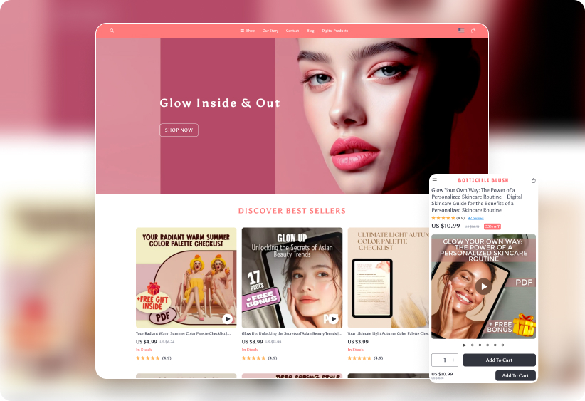 Beauty sells – and digital beauty sells fast. With the 500 Trending Beauty Guides Collection + Store Design, you get instant access to top-selling digital products covering skincare, makeup, haircare, and more.