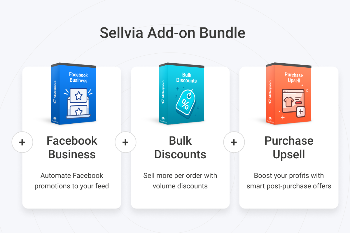 Do you want to drive plenty of curious customers to your store and motivate them to spend MORE money per a single purchase? How about inspiring them to order multiple items at once instead of buying one thing only? Imagine the difference that would make to your profits and to the efficiency of your ad campaigns! That’s exactly what the Sellvia Add-on Bundle was designed to do and it does the job brilliantly, letting you SAVE $71 as you’re getting SIX powerful tools in ONE set!