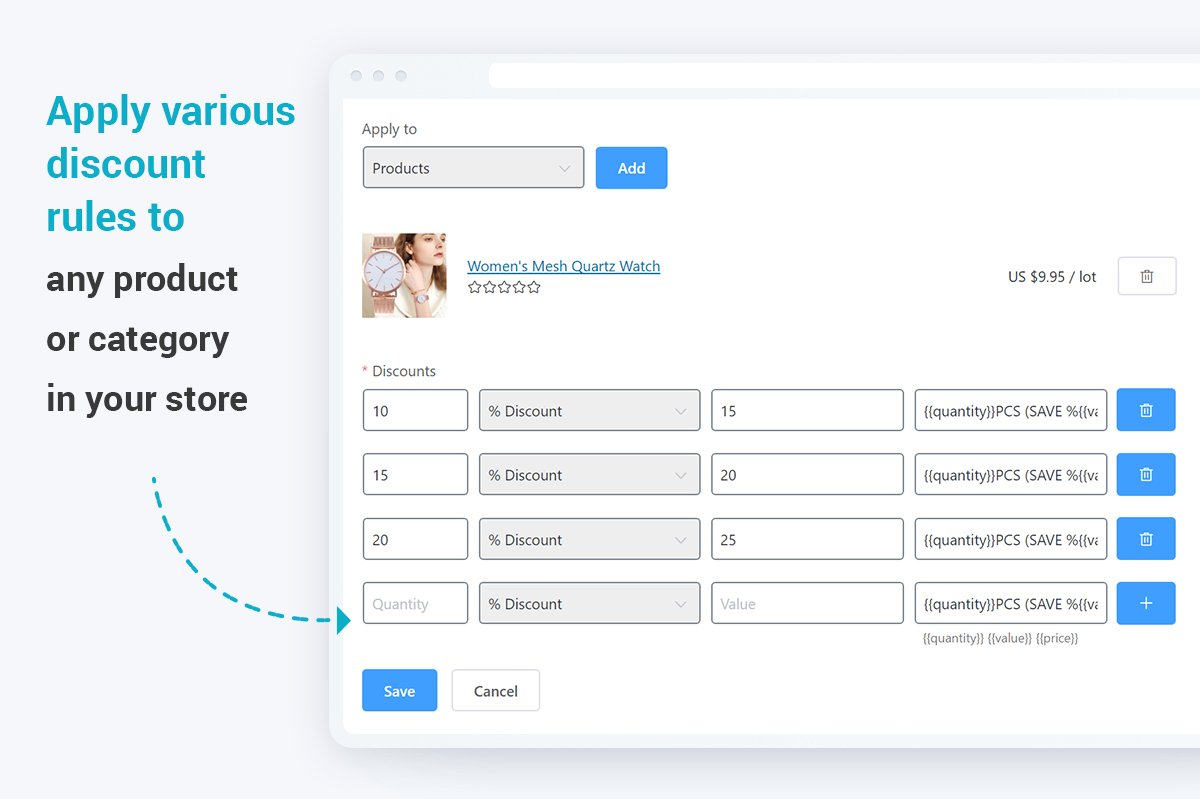 Manage discount rules in one place: select a product or a category, set your bulk pricing, write a catchy text to entice customers and don’t forget to save your progress. Set it up once, and start selling more while investing less time and effort!