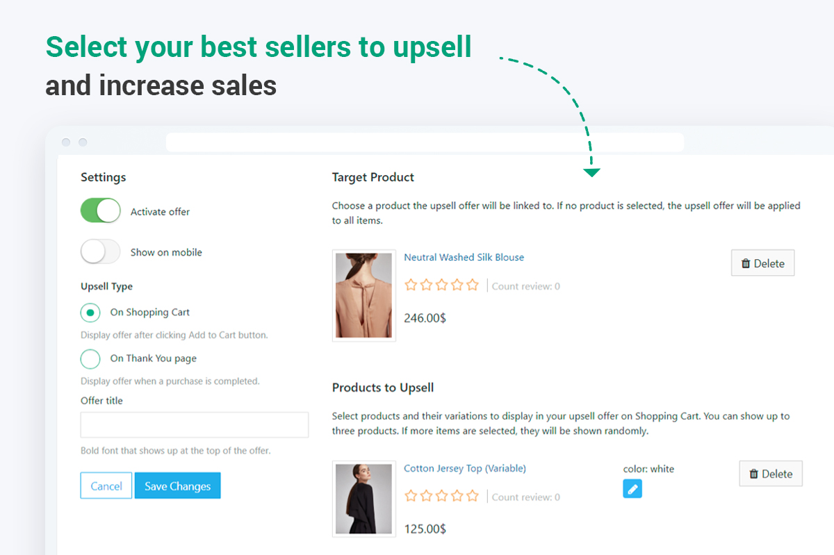 More specifically, you can easily select the main and upsold products, write a snazzy text to attract even more buyers, and choose the placement of the offer.