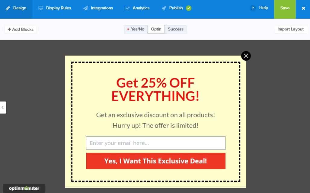 OptinMonster is a service that will help you create pop-ups or any other great things to collect email addresses. It doesn’t matter what device your customers use – you can easily create both desktop and mobile-friendly ads.