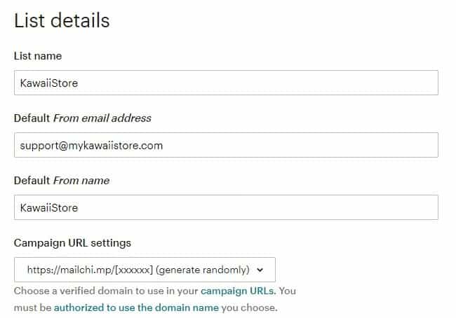 - List name – as this is your first list, you can just write the name of your store (KawaiiStore) or indicate the type of your pop up (KawaiiStore $150 coupon);