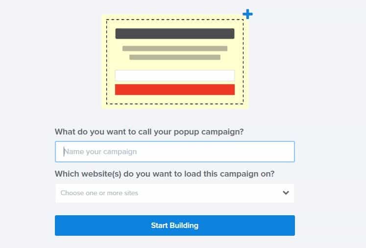Write the name of your pop-up campaign and choose your website. Click on the ‘Start Building’ button.