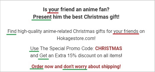 - Write in the second person (red stripes) and personalize if it’s possible. It means you should use the words “you, your, yours” and try to address to your customers by name. So your copy will be oriented towards the reader.