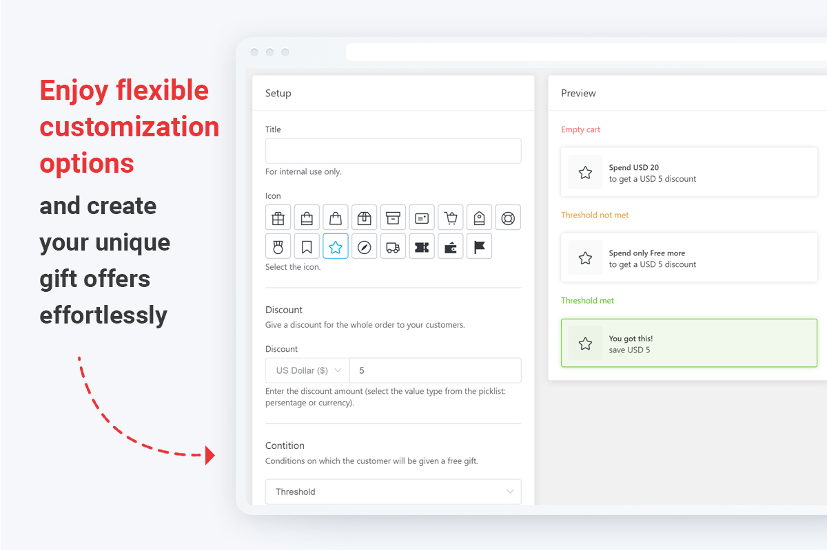 Change texts, select icons, select gift products, and set discounts in several clicks. The add-on is simple and easy to use.