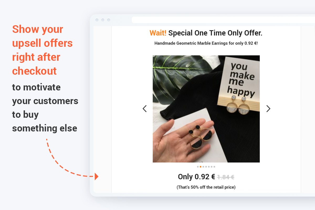 Once a customer clicks on the checkout button, there is your last chance to show him or her your best deals and increase the order value. Purchase Upsell allows you to create these post-purchase offers in several clicks and display them on upsell pop-ups to boost your revenue.