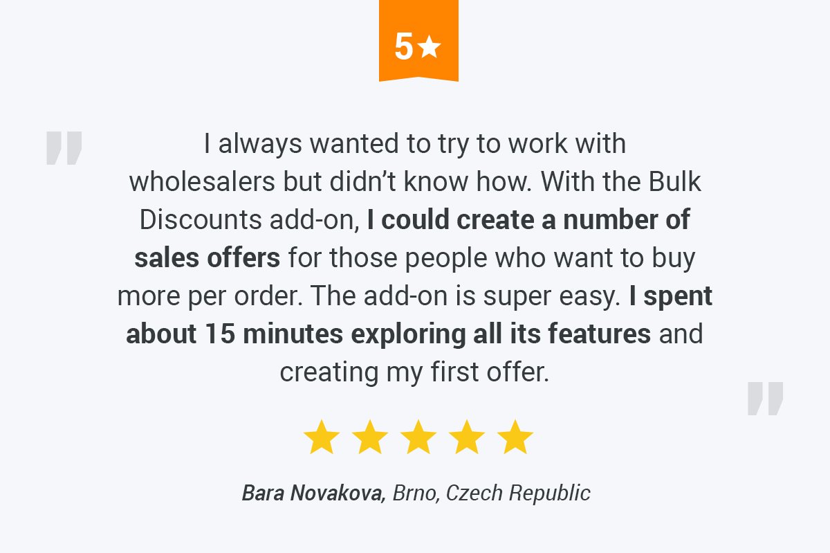 With the Bulk Discounts add-on, you can motivate your clients to buy more of your products in bulk, or even start working with wholesalers!