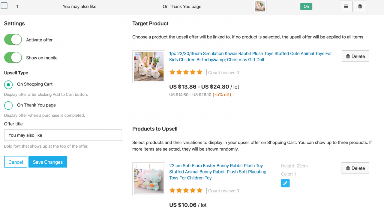 Create upsell offers based either on a single target product or a whole category